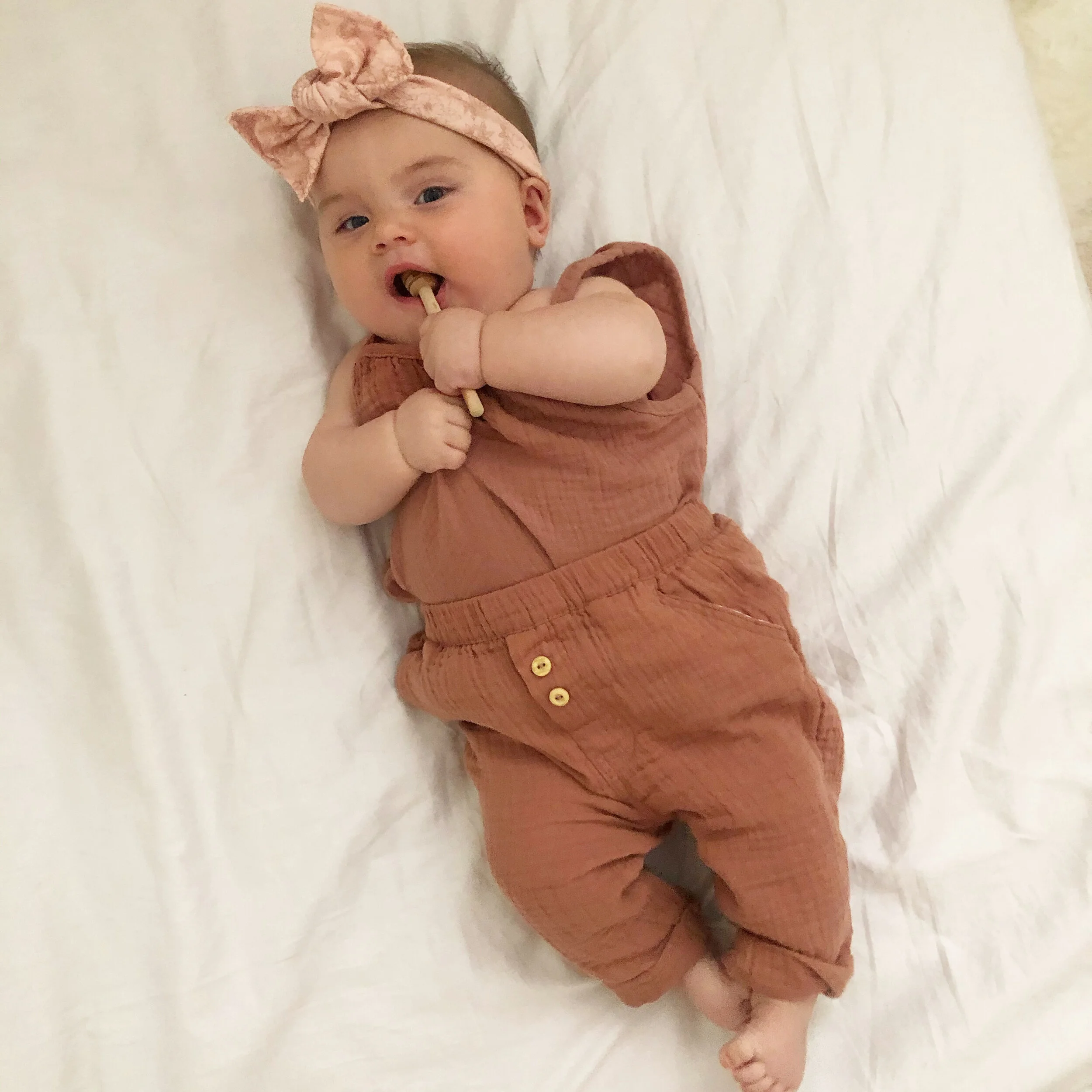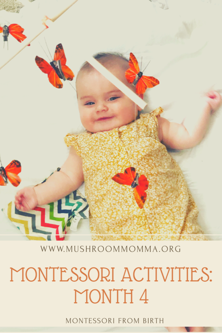 Dahlia is four months old! This month she has found her hands and feet, and can clasp her hands together. She can spend hours staring at her hands and reaching for objects. She can now grab objects next to her and discover and manipulate them. She often stares meticulously at them, or carefully mouths them. She also enjoys singing, her favorite is songs about butterflies (she gets huge grins and “sings” with me, cooing loudly as I sing).